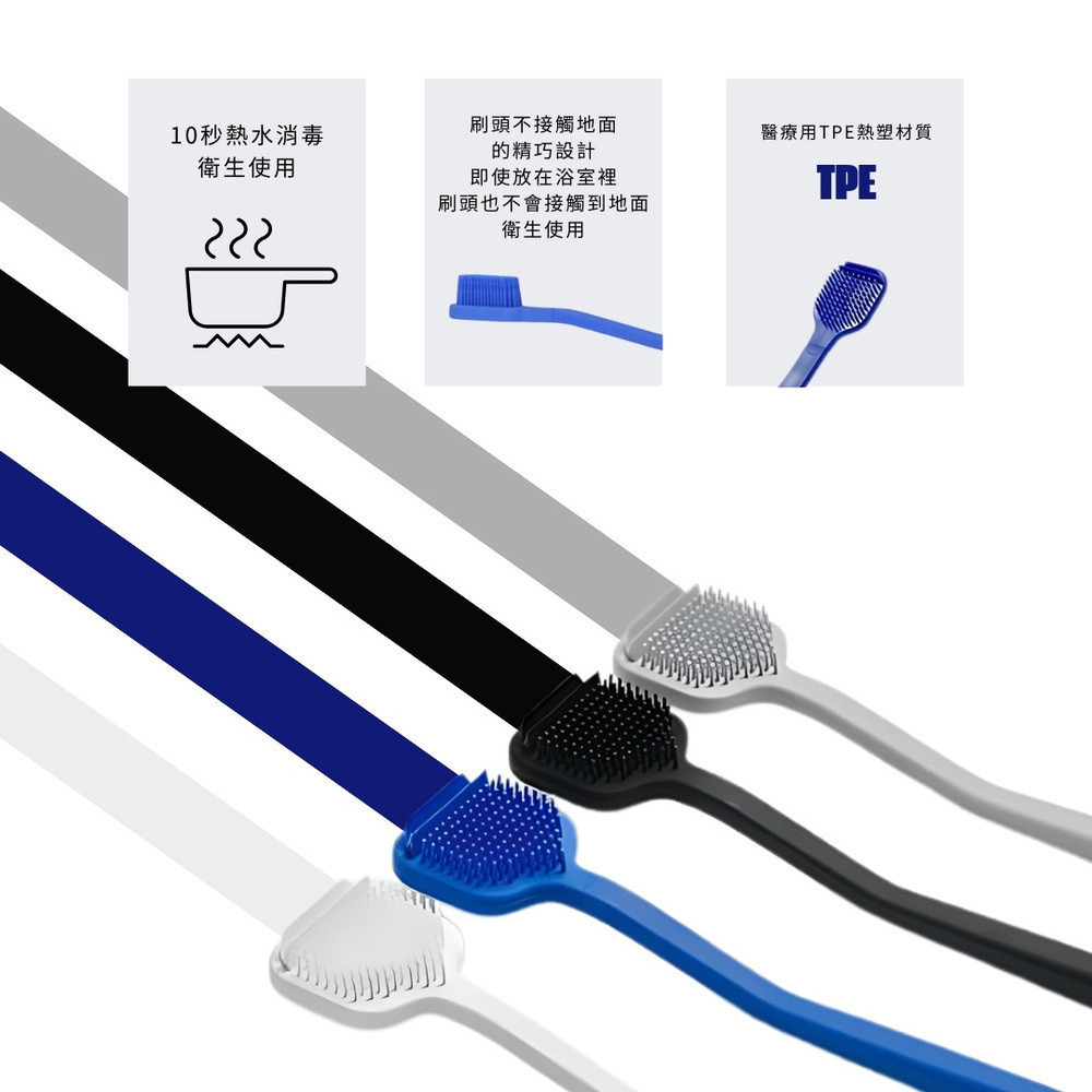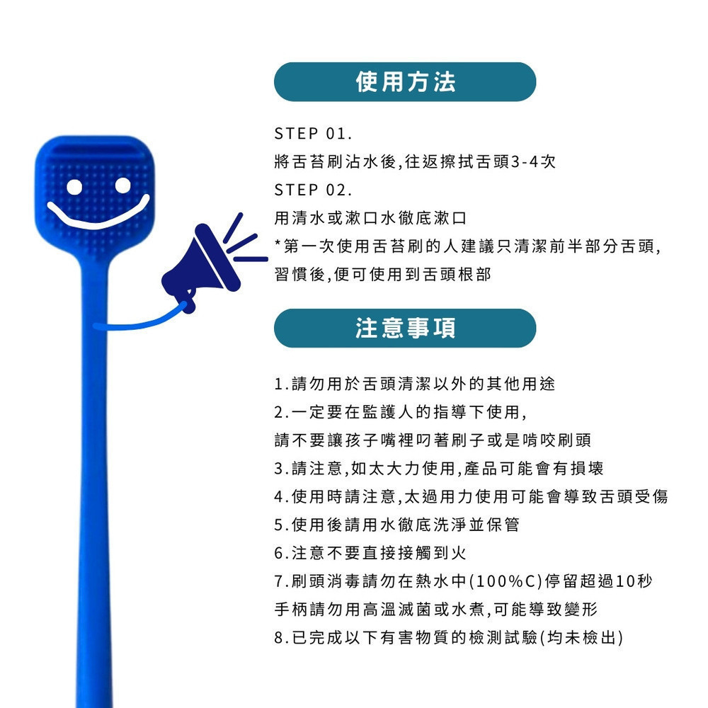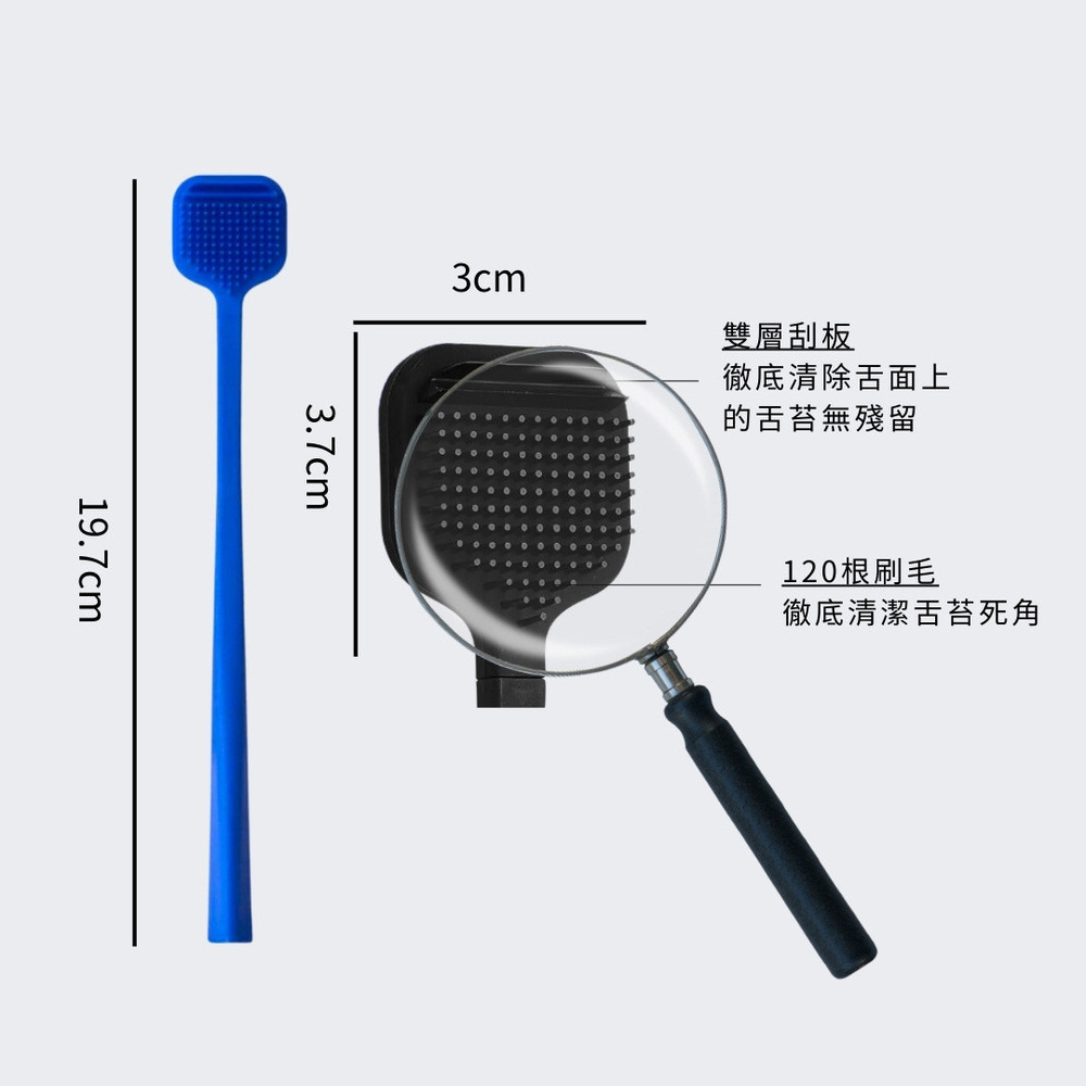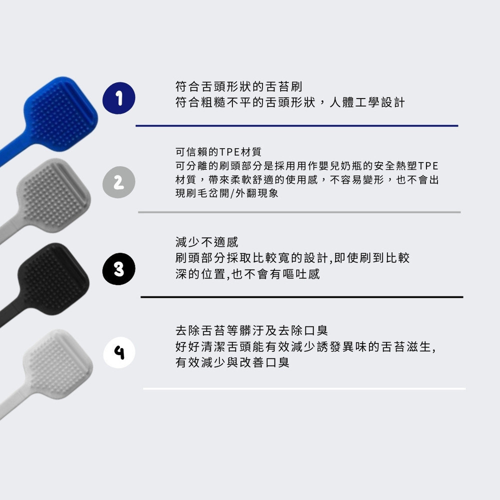 每次使用前務必清洗刷頭以確保衛生,請勿用力刮舌以免傷害口腔組織,如有刮舌時產生出血與不適應立即停止使用,建議三個月左右更換一次刷頭以保持衛生。▲舌苔刷:灰色GREY、黑色BLACK、藍色BLUE、白色WHITE
